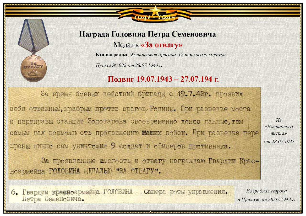 за подвиги, совершённые 19.07.1943-27.07.1943, был представлен к награде - Медаль "За отвагу": "За время боевых действий бригады с 19.7.43г. проявил себя отважным, храбрым против врагов Родины. При развезде моста и переправы станции Золотарёва своевременно донес данные, тем самым дал возможность продвижению наших войск. При разведке переправы лично сам уничтожил 9 солдат и офицеров противника". Наградной лист можно просмотреть ниже (при клике на фотографии она откроется в большем разрешении):